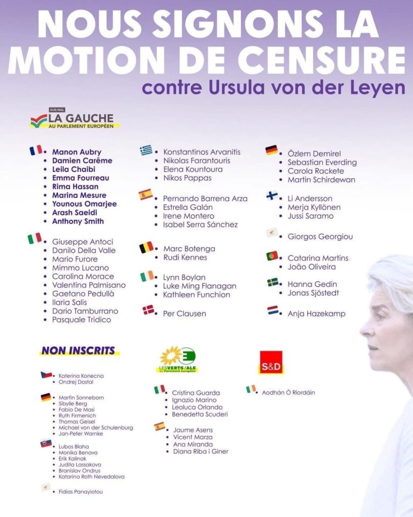 Z iniciatívy francúzskej ľavice v Európskom parlamente – tej, ktorej napriek jasnému volebnému víťazstvu prezident Macron nedemokraticky zobral právo zostaviť vládu – je na svete návrh na vyslovenie nedôvery Európskej komisie na čele s Ursulou von der Leyenovou. Ako vidíte na obrázku, svoj podpis pod návrh som pridal aj ja.