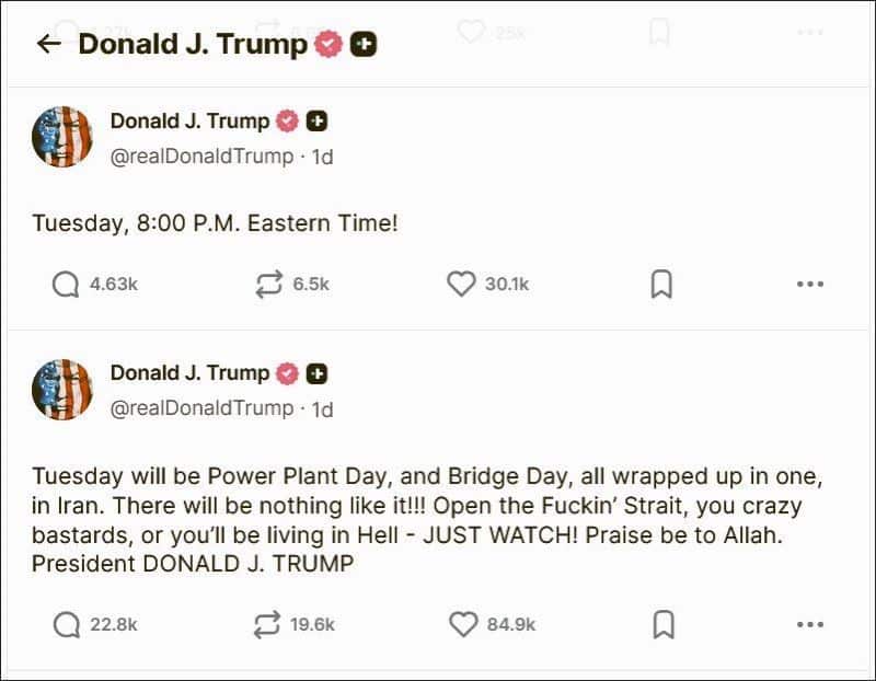 Utorok bude v Iráne Dňom elektrární a Dňom mostov, to všetko v jednom. Nič sa mu nevyrovná!!! Otvorte ten zasraný prieliv, vy šialení bastardi, alebo budete žiť v pekle – DAJTE SI POZOR! Chvála Alahovi.“
