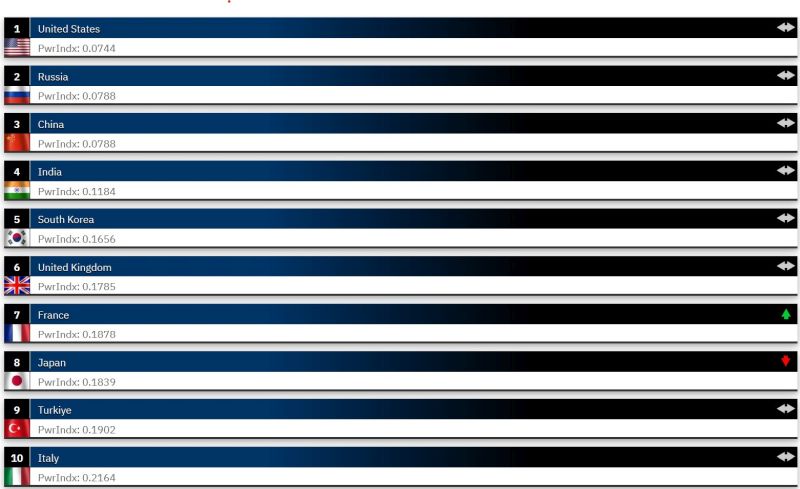 Podľa skóre Indexu sily sa v Prehľade 2025 dostali na prvých 10 miest USA (skóre 0,0744), RF (0,0788), ČĽR (0,0788), India (0,1184), Južná Kórea (0,1656), Veľká Británia (0,1785), Francúzsko (0,1878), Japonsko (0,1839), Turecko (0,1902), Taliansko (0, 2164). Nie je nám známy konkrétny spôsob výpočtu skóre indexu sily, ale nižší ako 0,0100 ho majú len tri štáty. V pásme od 0,0101 do 0,0200 je šesť štátov a v pásme 0,0201 – 0,0300 sa nachádza ďalších tiež šesť štátov.
