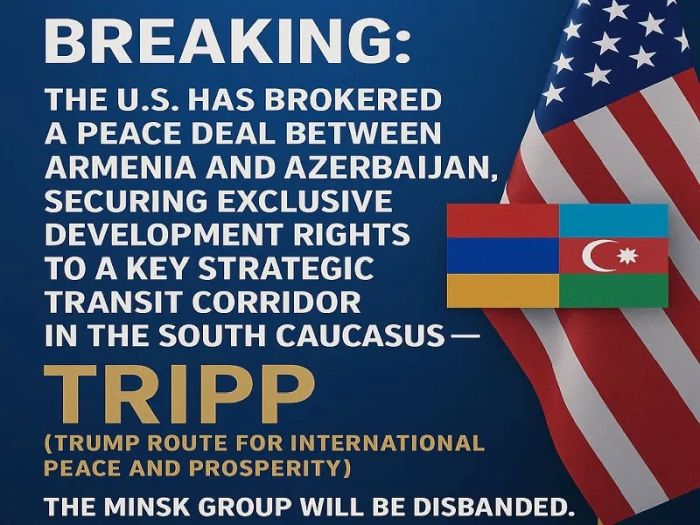Predstavitelia USA, Arménska a Azerbajdžanu spoločne predstavili „Trumpovu cestu k medzinárodnému mieru a prosperite (TRIPP) na piatkovom meetingu v Bielom dome. Koridor označený predtým v médiách ako „Trumpov most“ je v podstate US náhrada koridoru, ktorý Rusko predpokladalo v rámci prímeria, ktoré medzi týmito dvoma rivalmi sprostredkovalo v roku 2020.