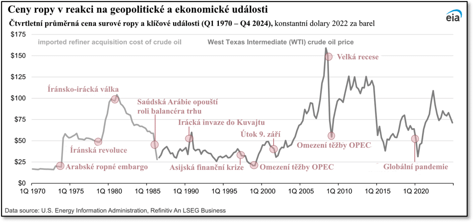 Další dějinotvornou událostí, v níž zásadní roli hrála ropa, bylo embargo arabských států sdružených v OPEC na vývoz ropy do západních zemí. Vše začalo v říjnu 1973 útokem egyptské a syrské armády na Izrael. V této válce, které se začalo říkat Jomkipurská, se Spojené státy slovy i činy postavily na stranu Izraele. Arabští producenti ropy se rozhodli omezit těžbu napřed o pět, později o 25 % – a zcela zastavit vývoz ropy do USA, později i do Nizozemí. Ještě před zahájením embarga Irák zestátnil ropná zařízení Exxonu a Mobilu v Basře. Cena ropy na světových trzích vzrostla téměř o 300 %. V USA, které byly závislé na dovozu ropy, klesl hrubý domácí produkt a vzrostla nezaměstnanost. Následující graf převzatý z analýzy zpracované Úřadem pro energetické informace USA (EIA) přibližuje vývoj ceny ropy WTI během této krize i krizí následujících až do roku 2024. Pokud jde o vliv současné izraelsko-americké agrese proti Íránu, v neděli byla cena barelu této ropy 99,6 dolarů, přičemž den před začátkem této války byla 67,0 dolarů.