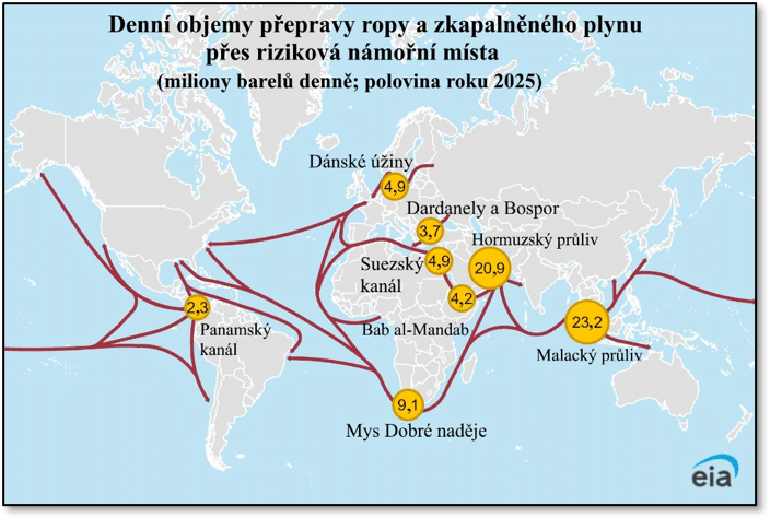 Od ropného šoku v roce 1973 se v USA stala otázka energetické bezpečnosti organickou součástí představ o národní bezpečnosti. Přesto v roce 1972 tvořil podíl importu ropy z oblasti Perského zálivu pět procent celkové spotřeby v USA, ale v roce 1976 to bylo 13 %. Zároveň však pod tlakem tohoto embarga Západ výrazně zvýšil důraz na nové, energeticky méně náročné technologie; v roce 1974 pak vznikla Mezinárodní agentura pro energii (IEA). Situaci v roce 1979 zkomplikovala již zmíněná islámská revoluce v Íránu a vstup Sovětské armády do Afghánistánu. Následující rok americký prezident Jimmy Carter prohlásil Střední východ za zónu životních zájmů Spojených států. K jejich zabezpečení Pentagon následně vytvořil jednotku rychlého nasazení, která v roce 1983 získala speciální vojenské velitelství, CENTCOM. Jeho oblast působení dnes zahrnuje 21 států – od africké Keni přes Írán a Pákistán po Kazachstán ve Střední Asii; od roku 2021 spadá do jeho odpovědnosti také Izrael. Toto velitelství, sídlící na Floridě, řídilo americké operace během válek v Perském zálivu (1990–1991), Afghánistánu (2001–2021) a Iráku (od roku 2003), ale také loni a letos proti Íránu. Podobná velitelství dnes zajišťují „dohled“ USA nad dopravními trasami, kudy směřují dodávky ropy do všech koutů světa. Následující mapa, vycházející z analýzy EIA, ukazuje podíl na globální dopravě ropy, ropných produktů a zkapalněného plynu přes nejdůležitější geostrategické body v polovině loňského roku. Podle tohoto zdroje bylo v té době přibližně 76 % vytěžené ropy a 13 % plynu k zákazníkům dopravováno po moři.