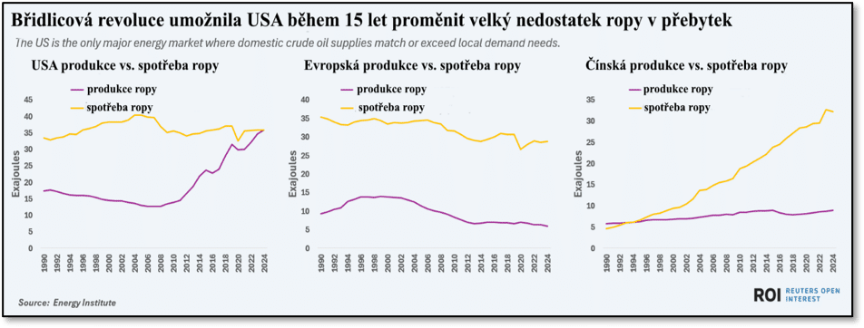 V pozadí změn v zahraniční politice USA je mimo jiné i dramatická proměna jejich pozice na globálním trhu s ropou a plynem. Spojené státy byly ještě nedávno čistým importérem těchto komodit, jejich domácí těžba nedosahovala úrovně potřeby. Tato závislost činila USA zranitelné. Jak ale připomíná Gavin Maguire ve svém rozboru pro agenturu Reuters, ze kterého je převzat i následující graf, díky těžbě z břidlicových ložisek vzrostla od roku 2010 produkce ropy ve Spojených státech o 150 % a plynu o 80 %. Zároveň se daří snižovat energetickou náročnost přírůstku HDP. Jestliže lze energetickou bezpečnost definovat jako jistotu dodávek, které jsou za přijatelné ceny a šetrné vůči životnímu prostředí, pak Spojené státy mají jistotu dodávek nezávisle na mezinárodní situaci.