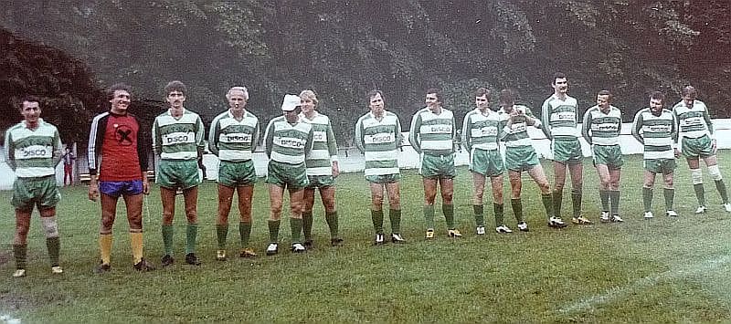 Futbalový zápas v Kremnici v roku 1983, Karol Duchoň je ôsmy zľava, deviaty vedľa neho je autor tohto textu. Foto: Ján Súkup