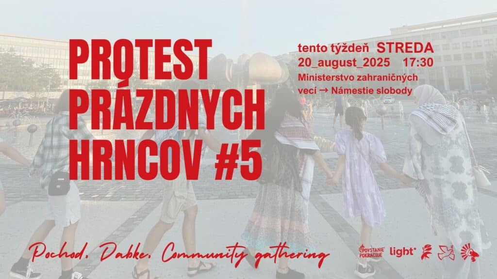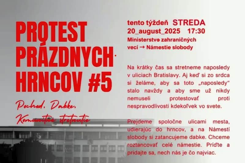 Pozor: tento týždeň sa protest uskutoční v #STREDU, nie vo štvrtok! Stretneme sa 20. augusta 2025 o 17:30 pred Ministerstvom zahraničných vecí a spoločne pôjdeme na Námestie slobody.
