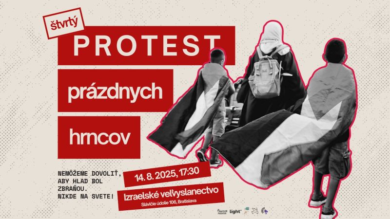 Už po 4-krát sa stretneme na proteste prázdnych hrncov, a to vo štvrtok 14. augusta 2025 o 17.30 pred izraelskou ambasádou (Slávičie údolie 106, Bratislava), kde sa postavíme proti hladomoru v Gaze, ktorý je výsledkom vedomej politiky Izraela, ktorý blokuje dodávky potravín, bombarduje obyvateľstvo a plánuje trvalú okupáciu Gaza City.